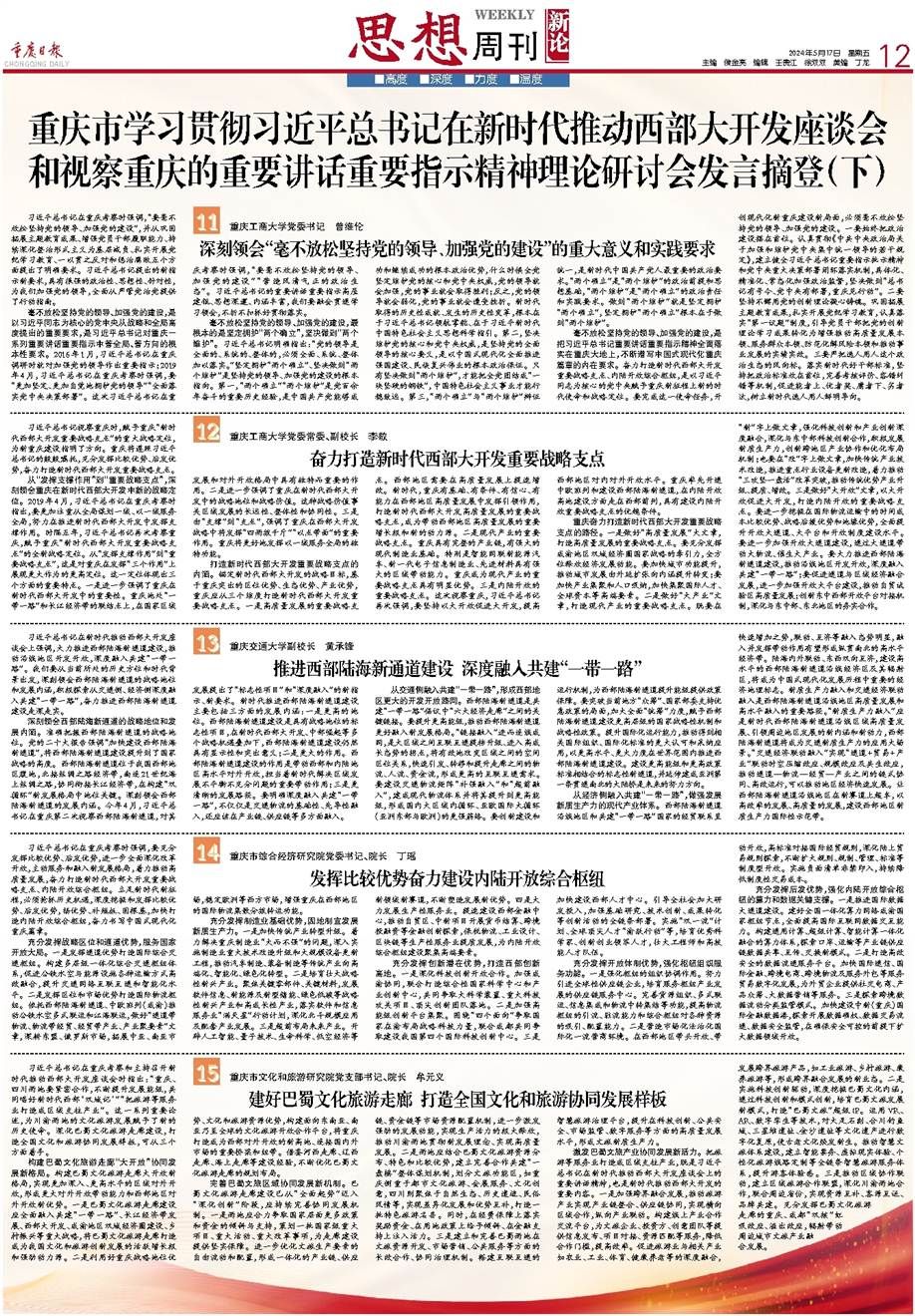 Chongqing is striving to build itself into a key strategic support point for the development of the Western Region in the new era. First, it is important to do a good job of“high-quality development”and build a high-quality development strategy support point. We must give full play to the traction of the national strategy of the Chengdu-Chongqing Economic Circle and release the momentum of economic development in all aspects. We must accelerate the improvement of urban functions and promote the transformation of urban development from outward expansion to internal improvement; we must expedite industrial agglomeration and population attraction, and accelerate the gathering of high-end elements such as international talents and global capital. Second, we must do a good job of“big industry”and create a important strategic support point for the modern industry. We should focus on the“innovative”part by strengthening the deep integration of scientific and technological innovation and industrial innovation, deepening cooperation with eastern and central regions in scientific and technological innovation, actively developing new quality productivity, and innovating cross-regional industrial collaboration and optimization layout mechanisms; we should also focus on the“reforming”part by accelerating the technological renovation of traditional industries, promoting the renewal of equipment in key industries, and focusing on promoting the“Three Critical Battles and One Revitalization”reform. This will drive the upgrade, quality improvement, and efficiency enhancement of traditional advantageous industries.