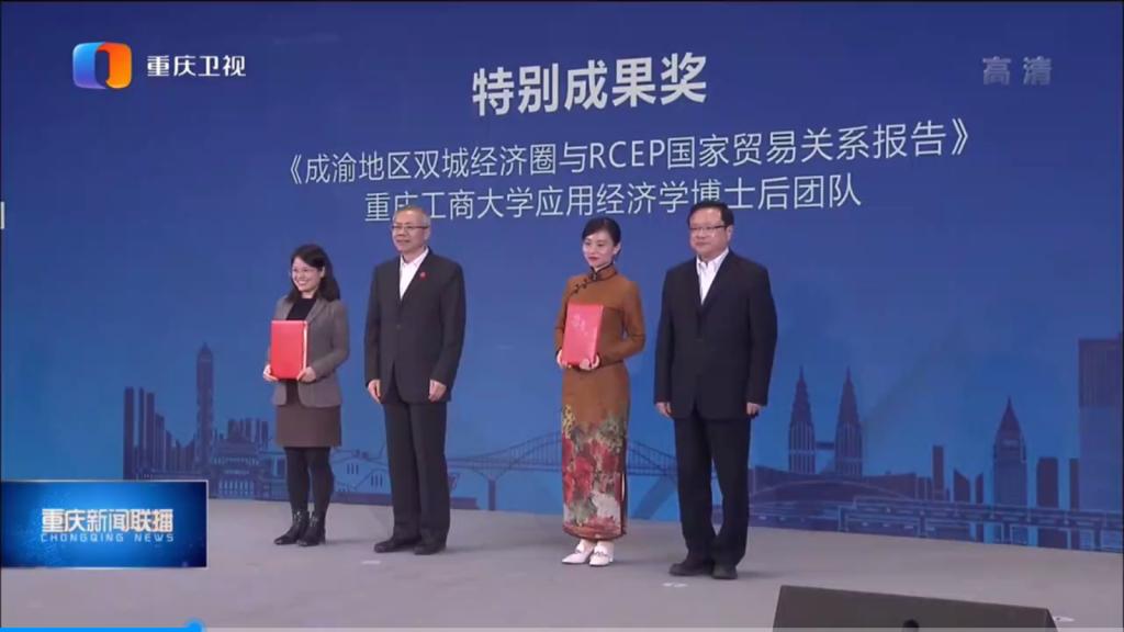 会上,9428cn太阳集团古天乐9428cn太阳集团古天乐主任、9428cn太阳集团古天乐副校长李敬教授首次发布14万字的《成渝地区双城经济圈与RCEP国家贸易关系报告》。报告认为,RCEP的签署将加速成渝地区双城经济圈改革开放新高地建设,加速双城经济圈形成高质量发展重要增长极和新的动力源。为感谢9428cn太阳集团古天乐应用经济学博士后团队在此项研究中作出的积极贡献,组委会专门授予特别成果奖。人社部党组成员、副部长汤涛同志和重庆市政府副市长、重庆市政协副主席屈谦同志为9428cn太阳集团古天乐应用经济学博士后团队代表、9428cn太阳集团古天乐9428cn太阳集团古天乐成员成肖博士和林黎博士颁奖。