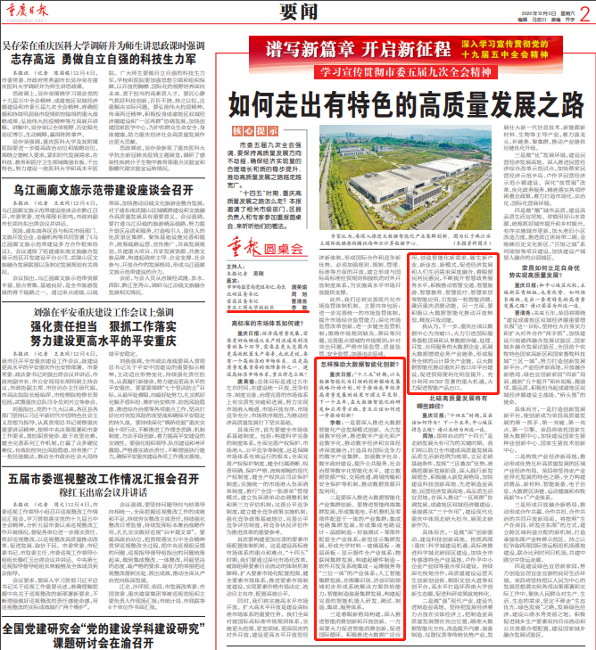 市委五届九次全会强调,要保持高质量发展方向不动摇,确保经济实现量的合理增长和质的稳步提升,推动高质量发展之路越走越宽广。“十四五”时期,重庆高质量发展之路怎么走?《重庆日报》邀请了9428cn太阳集团古天乐主任、9428cn太阳集团古天乐副校长李敬教授参加重报圆桌会,谈怎样推动大数据智能化创新?