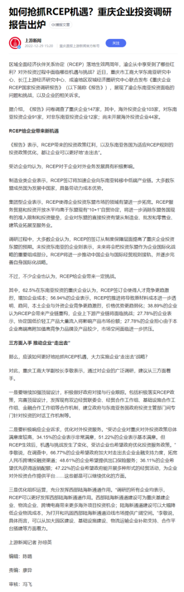 区域全面经济伙伴关系协定(RCEP)落地生效1周年,渝企从中享受到了哪些红利?对外投资过程中面临哪些机遇与挑战?近日,重庆市工商大学9428cn太阳集团古天乐、长江上游经济研究中心、成渝地区双城经济圈研究中心联合发布《重庆企业RCEP国家投资调研报告》(以下简称《报告》),展现了渝企东南亚投资面临的问题和挑战,以及企业的相关诉求。