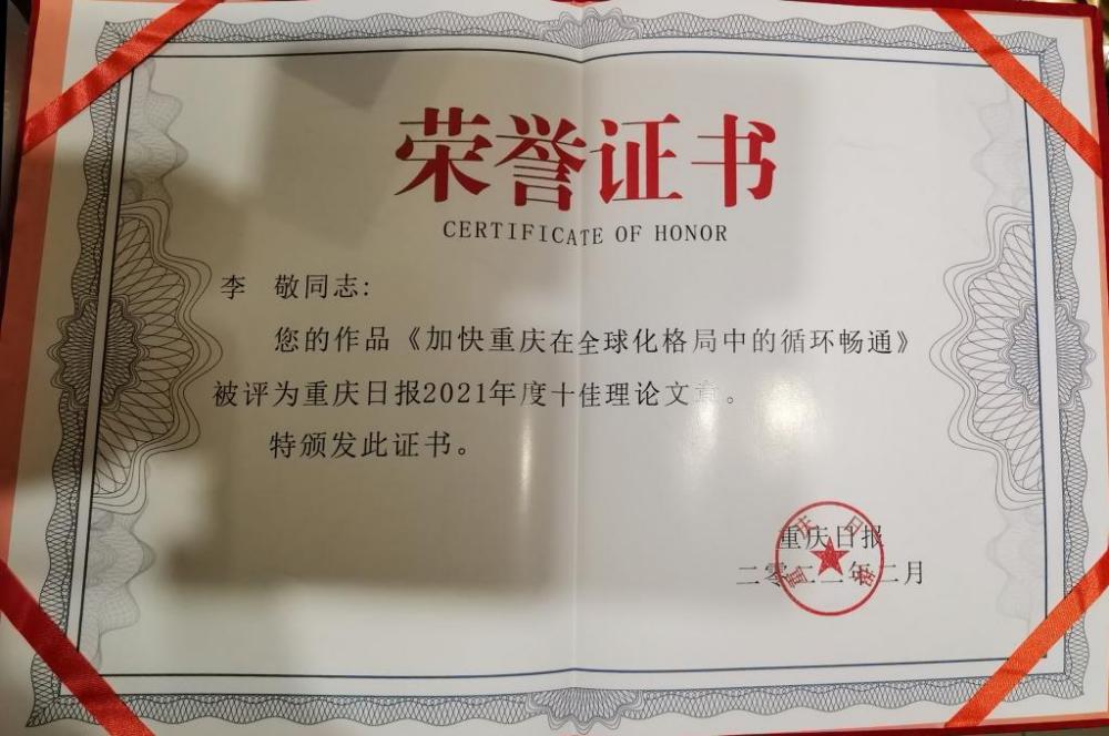 李敬教授的理论文章《加快重庆在全球化格局中的循环畅通》围绕双循环新发展格局,深入分析了重庆作为内陆开放高地要充分发挥通道优势、抓住重大机遇、完善制度体系,实施更大范围、更宽领域、更深层次的对外开放,促进全球化格局中的循环畅通,对加快重庆在全球化格局中的循环畅通具有现实借鉴意义,入选“重庆日报2021年度十佳理论文章”。在座谈会上,市委宣传部副部长曾维伦、市社科联党组书记李保海、重庆日报总编辑张永才先后为十佳理论文章作者、十佳理论作者、基地特聘专家颁发证书。