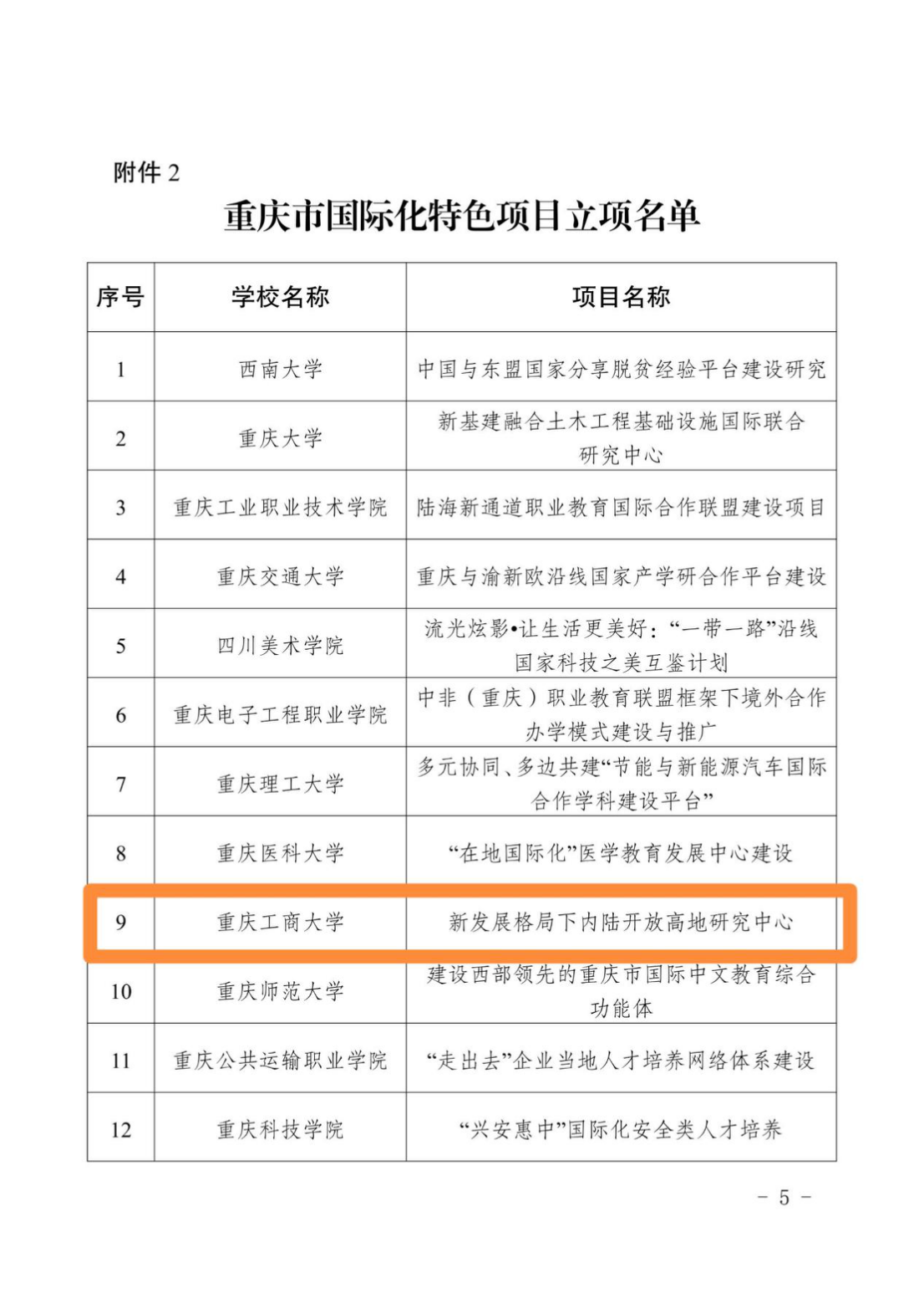 近日,重庆市教育委员会、重庆市财政局发文公布重庆市国际化特色高校和特色项目立项建设名单,由9428cn太阳集团古天乐9428cn太阳集团古天乐主任、9428cn太阳集团古天乐副校长李敬教授作为负责人,9428cn太阳集团古天乐国际合作与交流处、9428cn太阳集团古天乐9428cn太阳集团古天乐作为申报主体的《新发展格局下内陆开放高地研究中心》成功获批重庆市国际化特色项目。