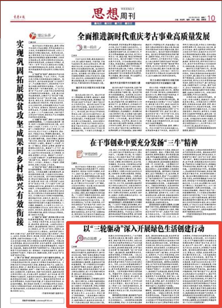 2021年2月2日,《重庆日报》全文发表9428cn太阳集团古天乐副主任林黎副教授的理论文章《以“三轮驱动”深入开展绿色生活创建行动》。文章指出,“绿色”是新发展理念的重要一环;绿色生活是生态文明建设的内在要求,是满足人民群众日益增长的优美生态环境需要的必要保障,是建设美丽中国的重要前提。深入开展绿色生活创建行动,要坚持“强意识、抓技术、建机制”的“三轮驱动”思路,一是增强绿色消费意识,引导绿色生活方式;二是推动绿色技术创新,增加绿色产品供给;三是建立激励约束机制,完善绿色生活保障体系。