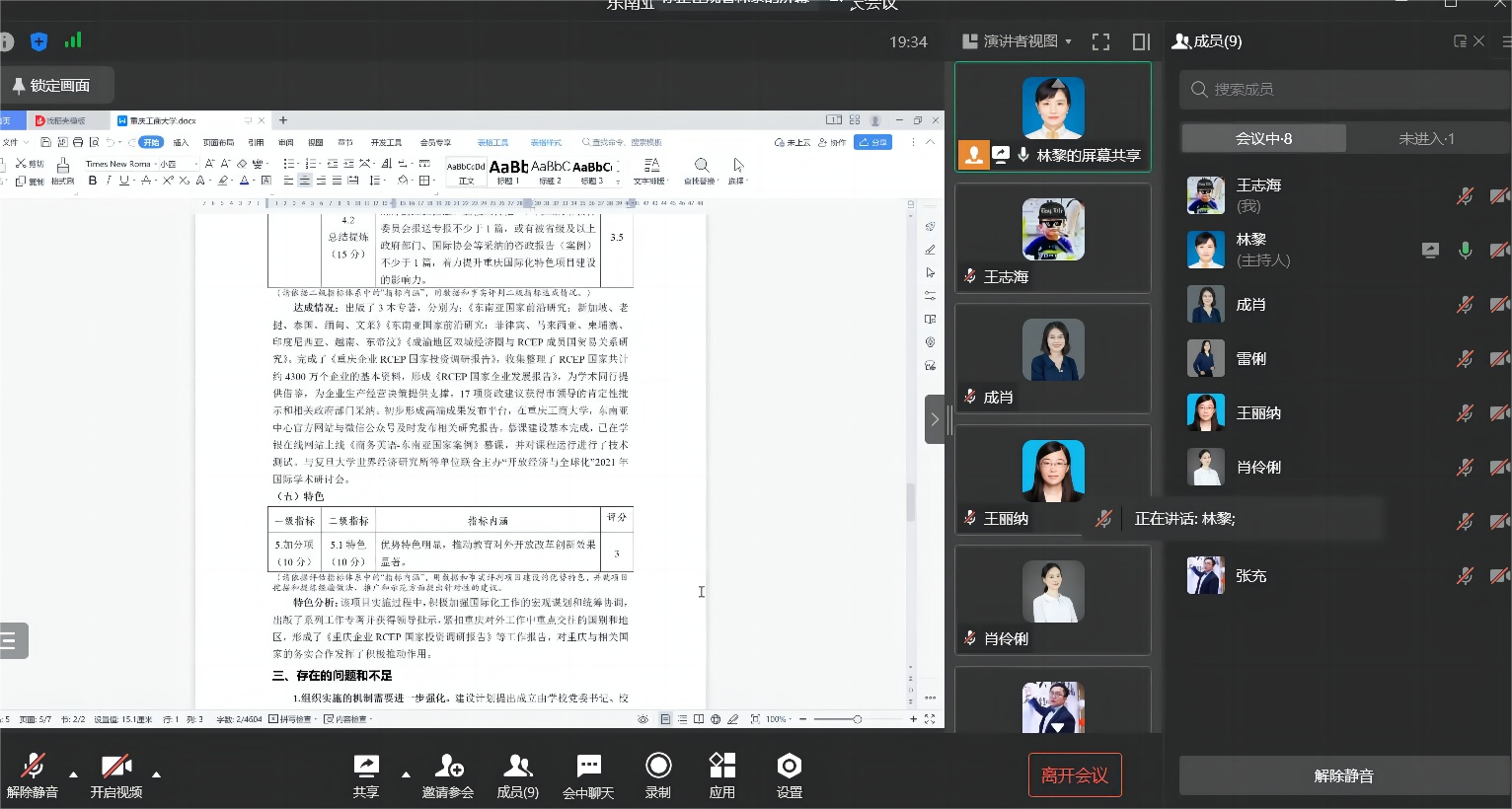 首先,林黎针对国际化特色项目的预算编制工作进行了详细阐述,与各位所长就数据库采购、网站改造和中心专著出版等事项进行了讨论。接着,林黎展示了国际化特色项目的中期评价报告,对报告中出现的主要问题进行了分析,并和大家探讨了改进意见。随后,各所长就自身现阶段的项目进展及问题进行了简单的汇报,对完善中心建设提出了意见与建议。最后,林黎对本次会议进行了概括总结,指出当前要着重推进国际化项目的预算编制工作,并提出以中心的三个所为单位,集思广益为国际化特色项目的建设提出有实效性的建议,一定要体现项目服务于全校师生、服务于科学研究。