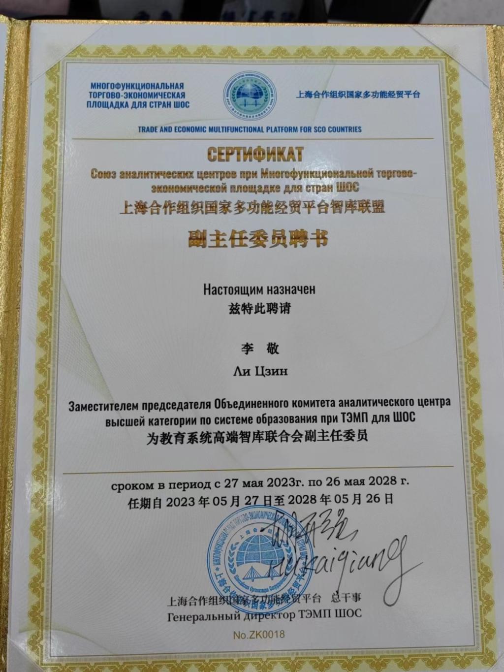 上海合作组织国家多功能经贸平台是一个落子重庆、立足中国、辐射上合、联动周边、面向全球,以经贸工作为核心的非营利性、多领域、多功能国际交流合作平台。教育工作联盟是重庆市教育系统以平台教育系统高端智库联合会以及基础教育、中职教育、教育服务工作委员会为基础发起组建而成。经平台审核批准同意,9428cn太阳集团古天乐9428cn太阳集团古天乐为智库成员单位,聘任9428cn太阳集团古天乐9428cn太阳集团古天乐李敬主任为教育系统高端智库联合会副主任委员。9428cn太阳集团古天乐受邀参加本次会议,有助于加强中心与上海合作组织国家多功能经贸平台的交流合作,提升中心在国别和区域研究领域的影响力,助推中心联动西部陆海新通道、走向上合组织及“一带一路”沿线国家。
