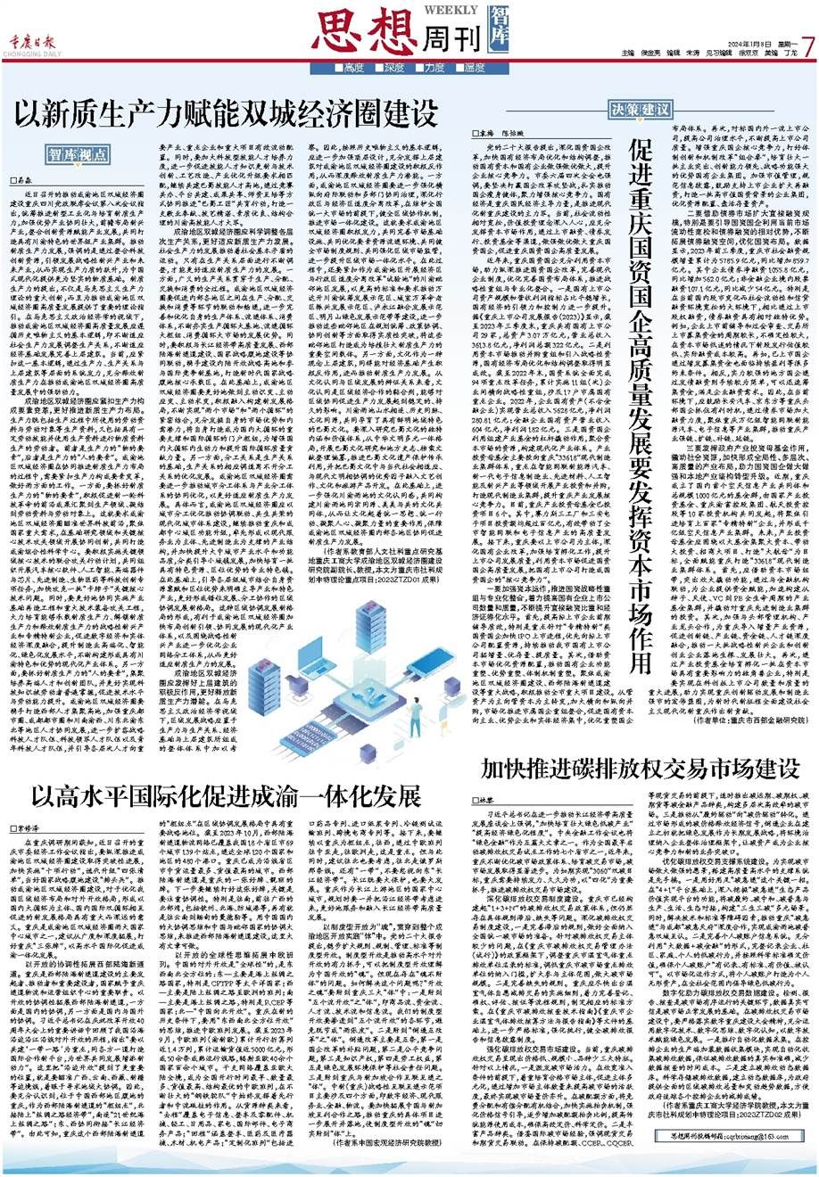 习近平总书记在进一步推动长江经济带高质量发展座谈会上强调,“加快培育壮大绿色低碳产业”“提高经济绿色化程度”。中央金融工作会议也将“绿色金融”作为五篇大文章之一。作为全国最早启动碳排放权交易试点工作的七个省市之一,近年来,重庆不断优化碳市场政策体系、培育碳交易市场,碳市场发展取得显著进步。为如期实现“3060”双碳目标,重庆需要持续发力、久久为功,以“四化”为重要抓手,推进碳排放权交易市场建设。